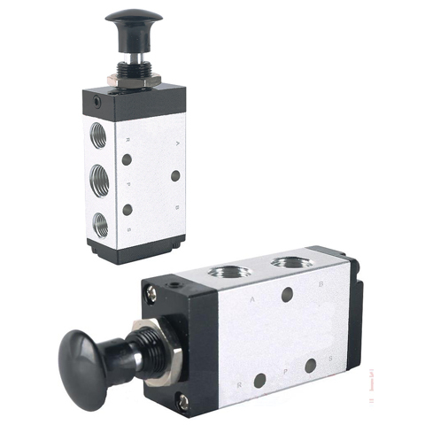 4R Manual Operated Push Valve 1/8" 1/4" 3/8" Pipe Size 5/2 Way ●2/5 pneumatic hand push valve 4R series for 5 port ●4R Series pneumatic hand push valve for pneumatic directional control, ●5 Port Hand Valve, 2-position, spring return spool valve with aluminum body ●1/8 inch,1/4inch, 3/8 inch NPT,G,PT female ports, ●Push Valves 5Port: 4R110-M5,4R110-06,4R210-06,4R210-08,4R310-08,4R310-10,4R410-15 4R Push Valve Symbol: